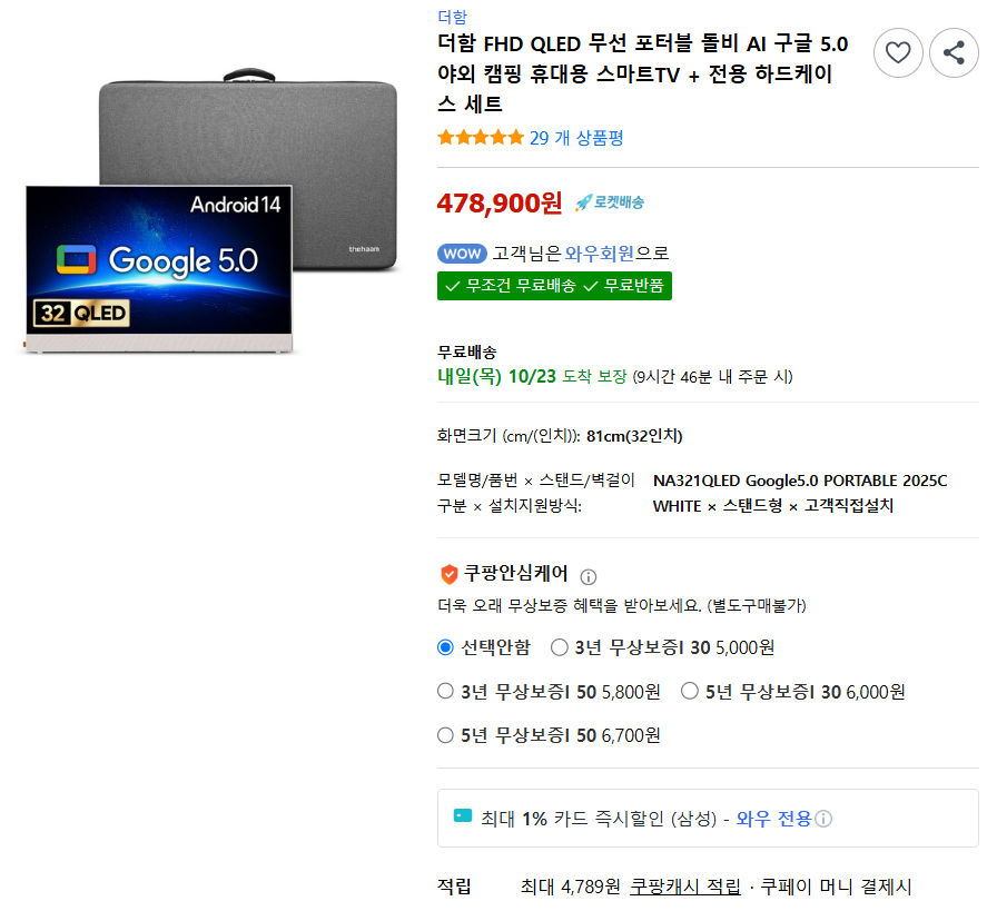쿠팡에서 더함 FHD QLED 무선 포터블 돌비 AI 구글 5.0 야외 캠핑 휴대용 스마트TV + 전용 하드케이스 세트 구매하고 더 많은 혜택을 받으세요! 지금 할인중인 다른 소형 TV 제품도 바로 쿠팡에서 확인