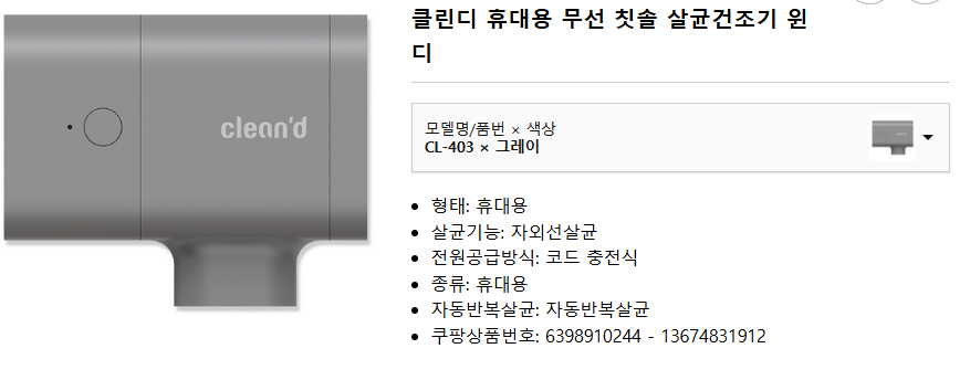 1. 클린디 휴대용 무선 칫솔 살균건조기 CL-403