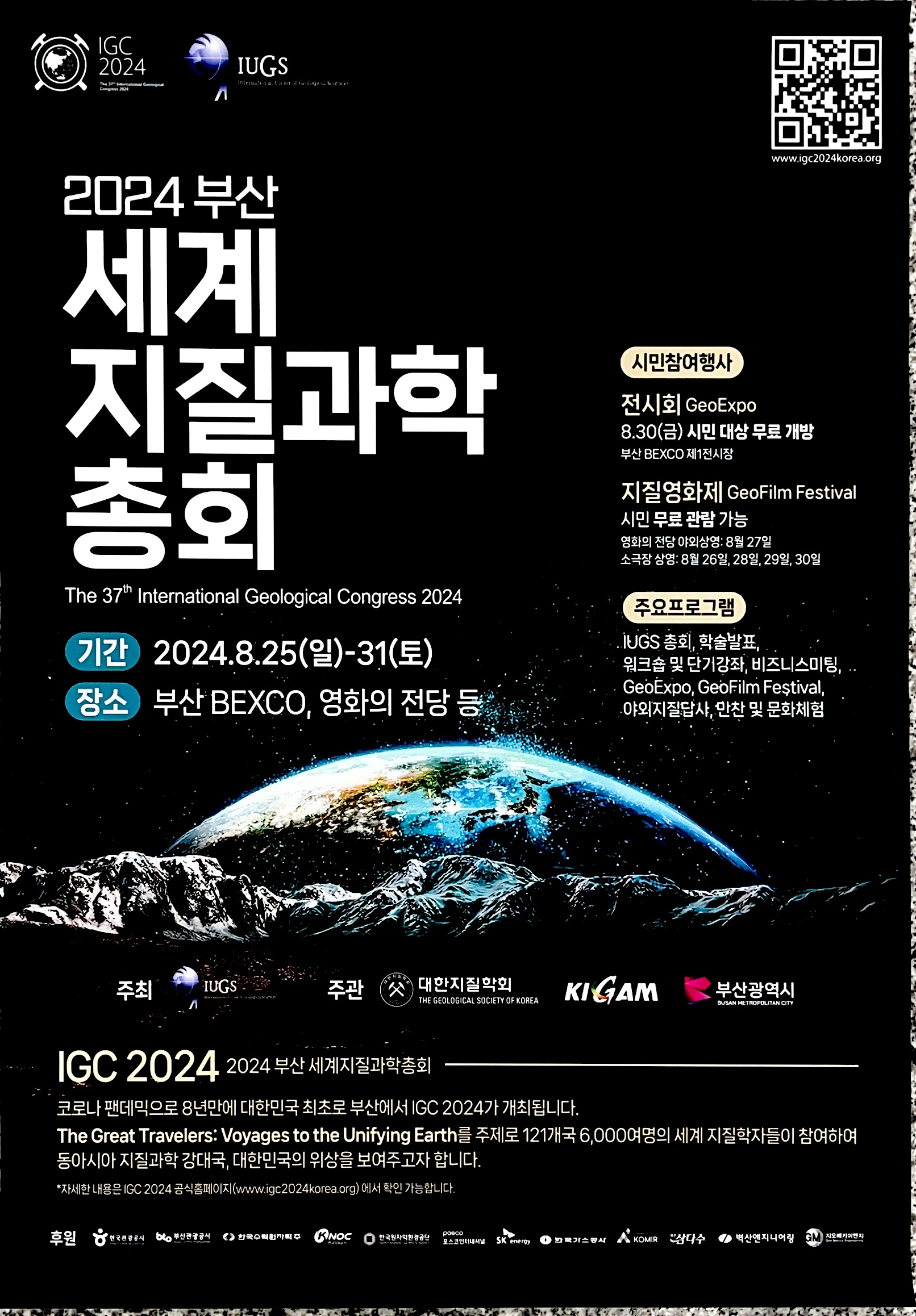 2024 부산 세계지질과학총회는 국제지질과학연합(International Union of Geological Sciences, IUGS)이 주최하는 세계 최대의 지질과학 학술 행사로, 2024년 8월에 부산에서 개최됩니다. 이번 총회는 전 세계의 지질학자, 연구자, 정책 결정자 등이 한자리에 모여, 지질과학의 최신 연구 결과와 기술 발전을 논의하고, 지구의 미래를 위한 해결책을 모색하는 중요한 자리입니다. 부산은 아시아의 대표적인 해양 도시로, 이곳에서 개최되는 세계지질과학총회는 더욱 의미 있는 학술 교류의 장이 될 것입니다.